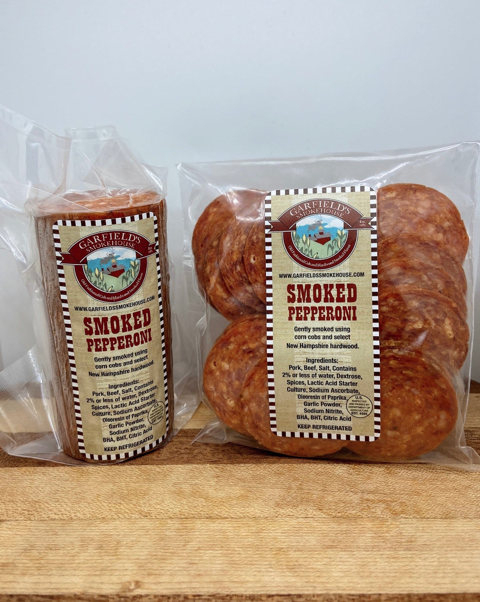 Our cob and hardwood small batch pepperoni is carefully smoked for an extra smokey flavor. Our cheeses are cold smoked until the signature Garfield's hearty and bold old fashioned smoked flavor is achieved.